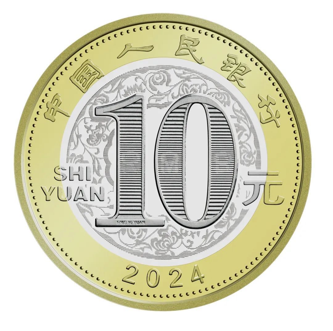 双色铜合金纪念币正面图案为“中国人民银行”、“10元”字样,汉语拼音字母“SHIYUAN”及年号“2024”,底纹衬以团花图案。