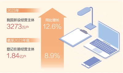 本报北京3月13日电(记者林丽鹂)国家市场监督管理总局日前发布数据显示:2023年,我国新设经营主体3273万户,同比增长12.6%。其中,新设企业1002.9万户,增长15.6%;新设个体工商户2258.2万户,增长11.4%。